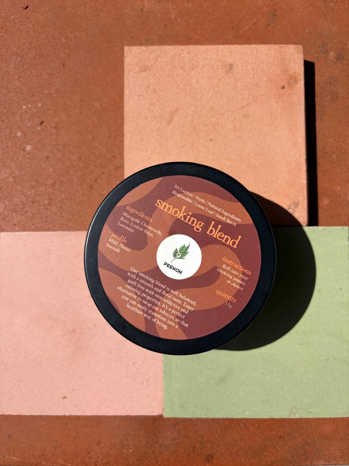 Description: 15 grams of our smoking blend, packaged nicely in an aesthetically pleasing, reusable tin. Convenient for you and the environment.